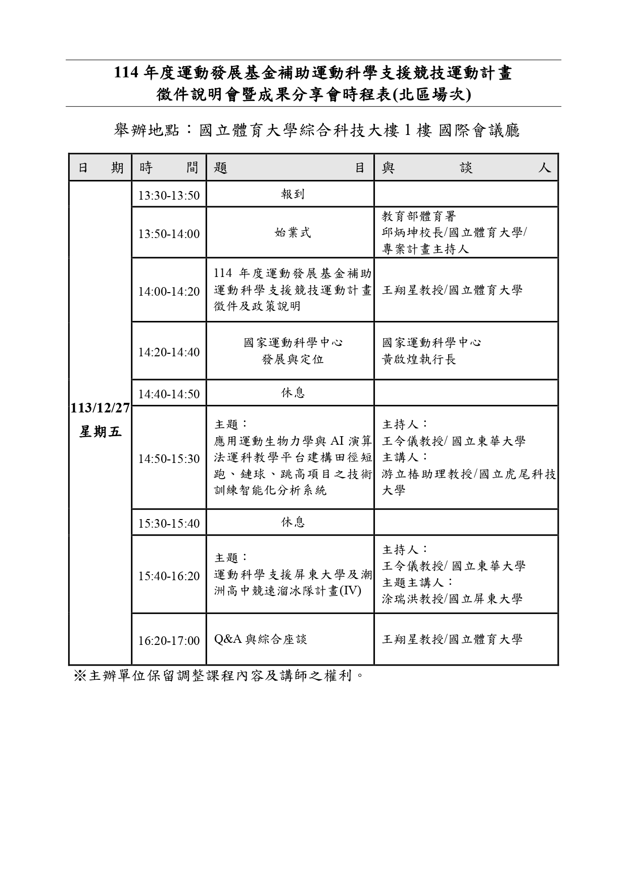 114年度運動發展基金補助運動科學支援競技運動計畫徵件說明會暨成果分享會-北區場次 2024-11-27 AdminAdmin 114年度運動發展基金補助運動科學支援競技運動計畫徵件說明會暨成果分享會-北區場次